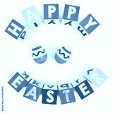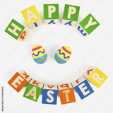 HAPPY EASTER greeting spelled with colorful toy blocks with decorated plastic eggs.