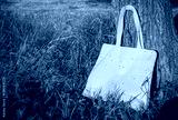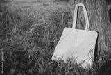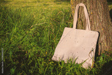White canvas tote bag mockup template with long handles among the green plant leaves near the tree outdoor