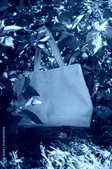 White canvas tote bag mockup template with long handles among the green plant leaves outdoor