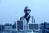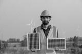 Smiling bearded young engineer in hard hat holding solar panels in wind farm. Clean renewable energy concept for the future