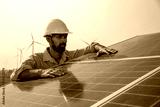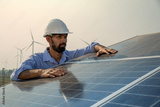 Young bearded engineer checking an operation and cleanliness of photovoltaic solar panels during the day. Concept renewable energy, technology, green energy for the future