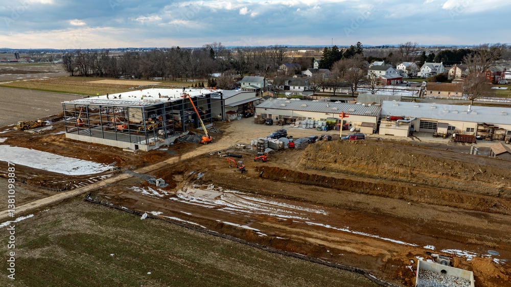 Heavy machinery is at work on developing a new commercial building in a rural landscape. Nearby homes and fields are visible, highlighting the expansion effort during the late afternoon.