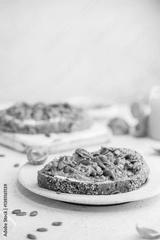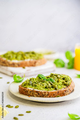 Healthy avocado toast for breakfast or lunch with whole grain bread and pumpkin seeds on a white table. Holistic nutrition concept. Health care, super food concept.