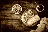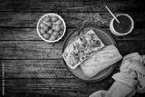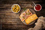 Sandwiches with canned tuna, tomato and olives. Bocadillo with tuna. Food recipe background. Close up, top view