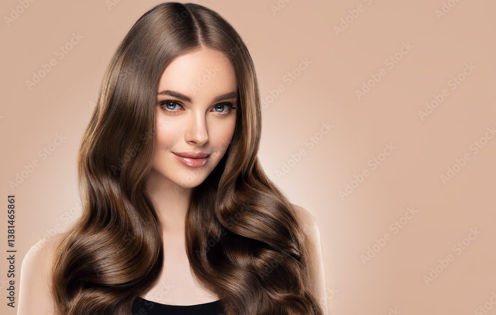 Beauty girl with long and shiny wavy hair . Beautiful woman model with curly hairstyle .