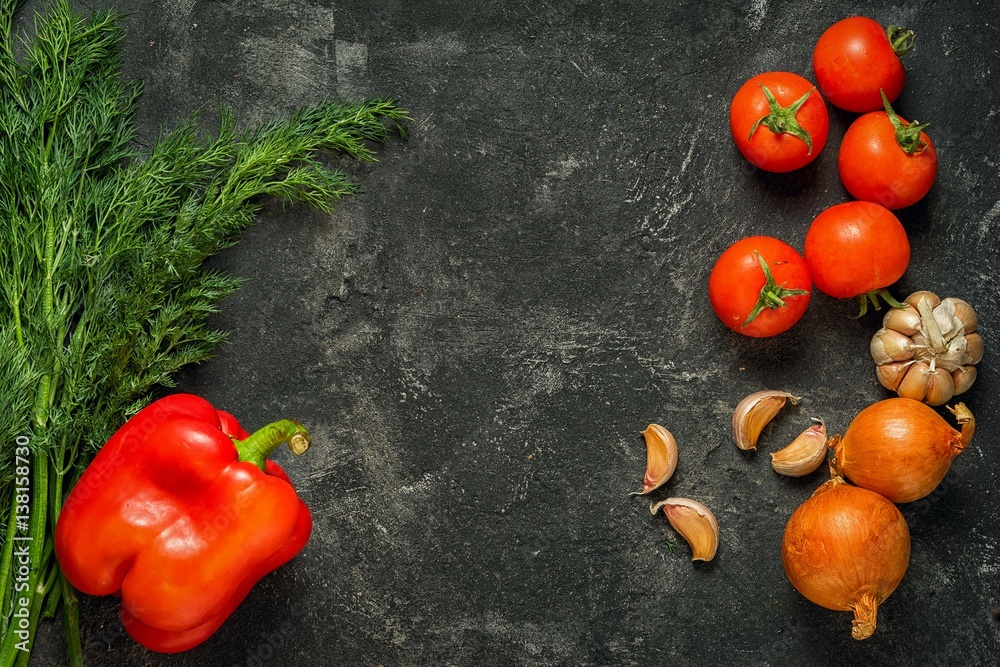 frame from vegetables at the two sides of the dark black cement background with copy space for your text