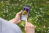 Woman using mobile phone to listen to music outdoors, closeup. Open music player app on device screen