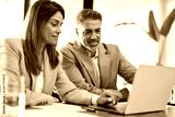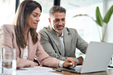 Two busy professional older business partners colleagues working in office looking at laptop computer. Executive leaders managers discussing digital project strategy together at corporate meeting.