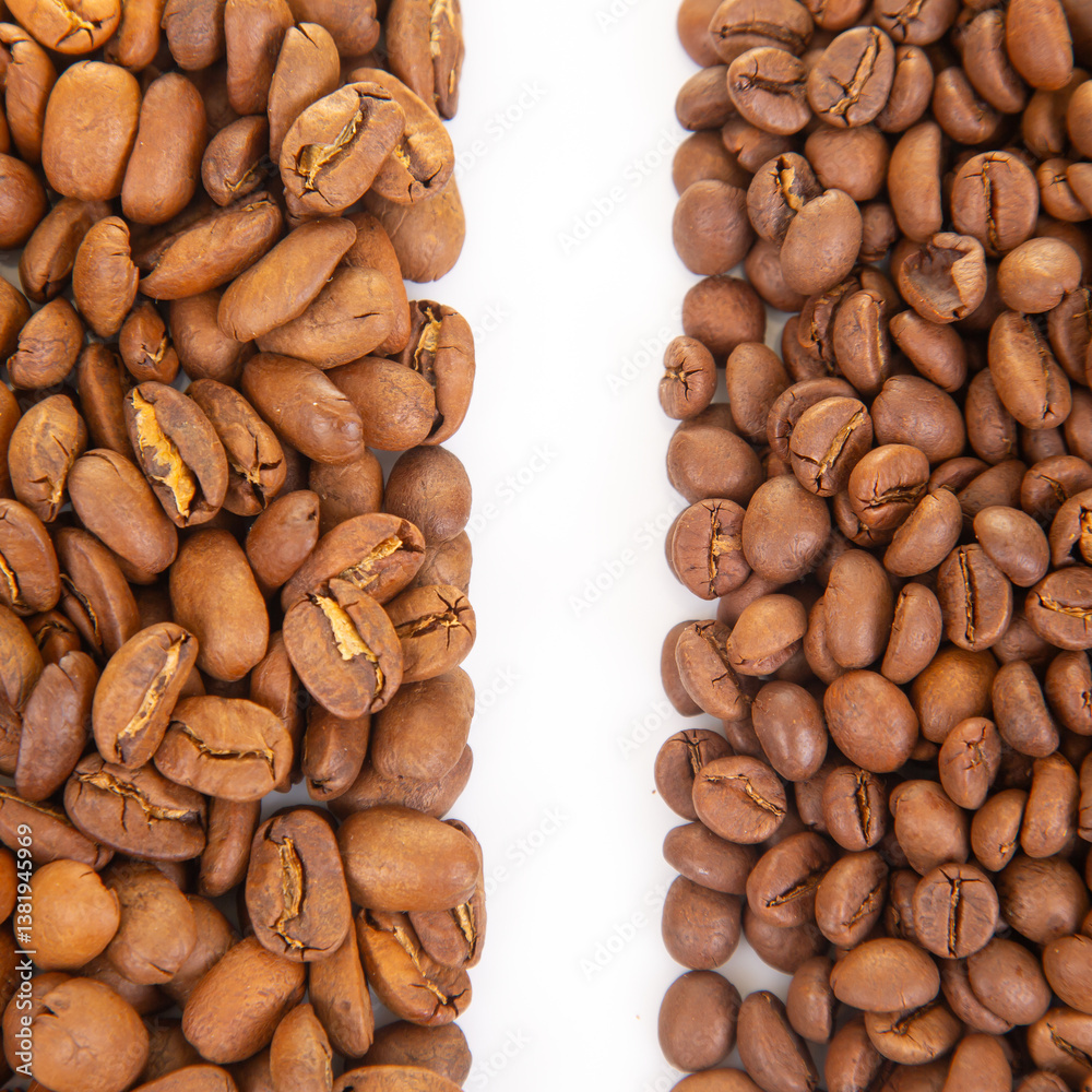 Close-up of roasted coffee beans in two tones on a white backdrop, highlighting their earthy hues and cracked surfaces. Perfect for gourmet coffee visuals.