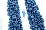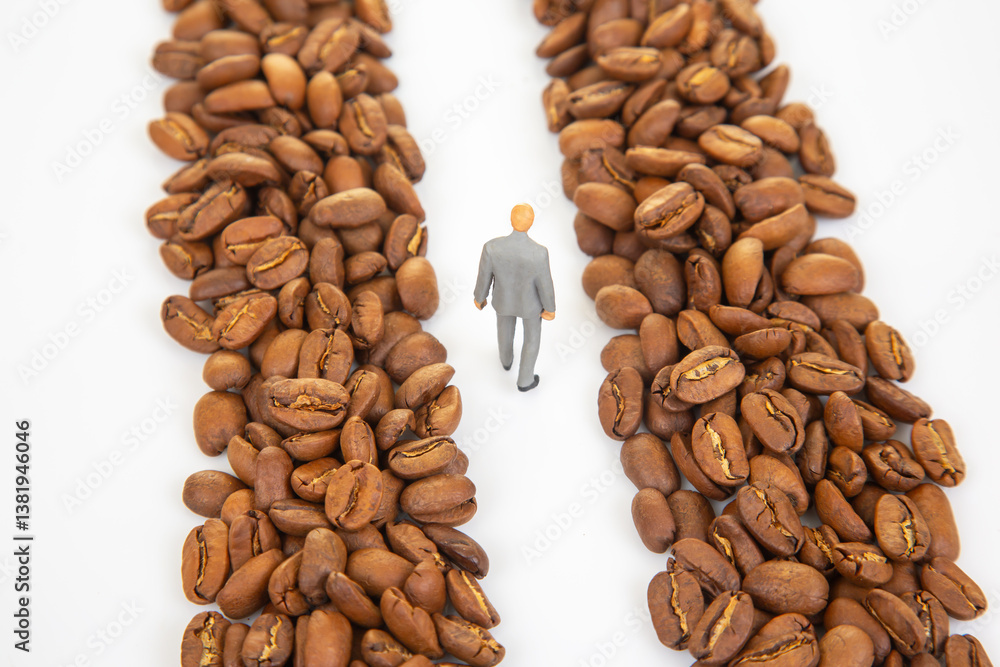 Unique stock photo featuring a small figurine in a suit walking through coffee beans, illustrating a business path in the coffee market