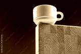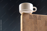 A white ceramic cup balances precariously on the edge of a wooden cutting board against a dark background, creating a striking and minimalist composition with warm wood grain texture.