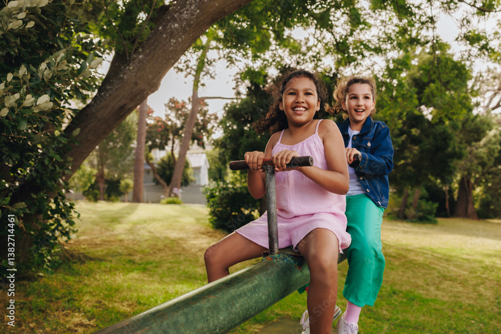 Two young children playing on a seesaw in a sunny park setting