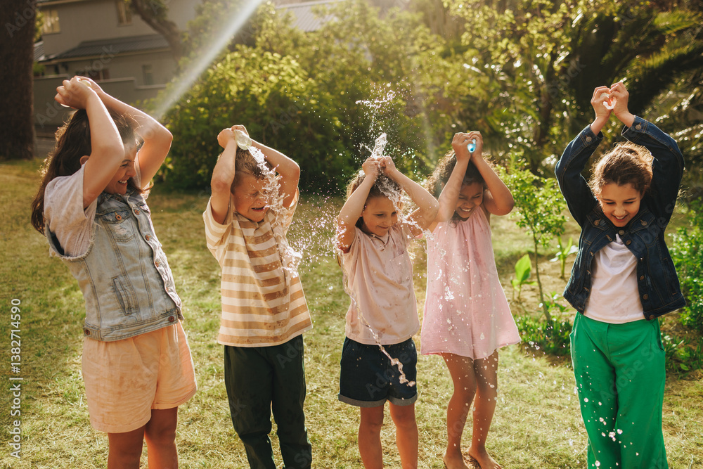 Five children enjoying a fun water splash activity on a sunny day outdoors