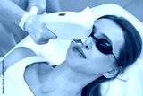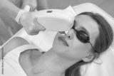 Young caucasian female receiving laser facial treatment in spa clinic with protective eyewear.