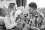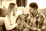 Portrait of a young couple on the livingroom with golden retriever dog indoors at home.