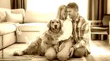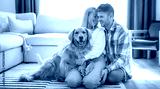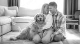 Portrait of a young couple on the livingroom with golden retriever dog indoors at home.