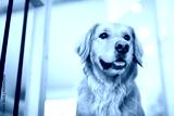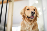 Portrait of happy healthy dog indoors in living room at home. Cute golden retriever