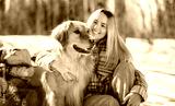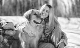 Portrait of a young woman outside on spring season with golden retriever dog