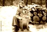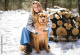 Portrait of a young woman outside on spring season with golden retriever dog