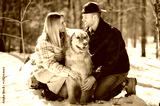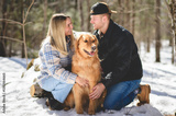 Portrait of a young couple outside on spring season with golden retriever dog