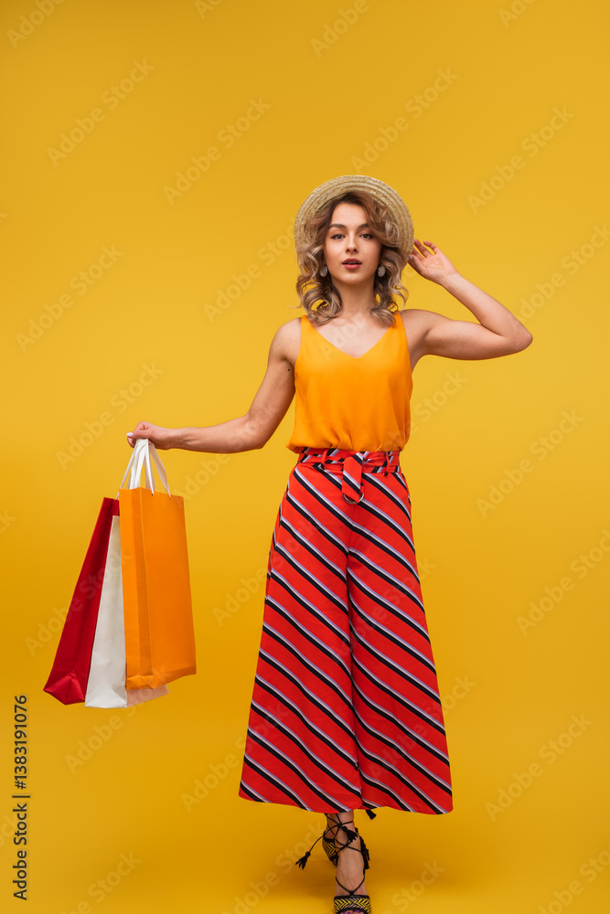 Stylish woman wearing summer outfit and holding shopping bags on a bright orange backdrop, depicting shopping fun and vibrant energy.