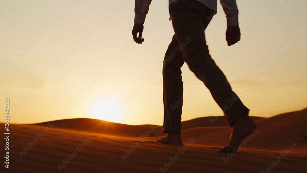 Bare male feet walking on sand dunes in the desert close-up. Close-up of a young man's feet walking on the sands in the desert during sunset. Human bare feet in trousers walks on sand.