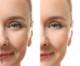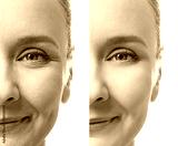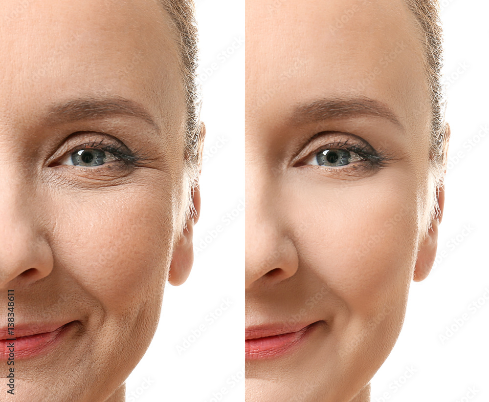 Mature woman face before and after cosmetic procedure. Plastic surgery concept.