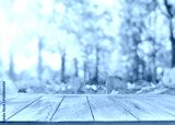 Autumn empty wooden table with falling yellow maple leaves on defocused autumn forest nature background at sunset. Thanksgiving, Halloween or autumn background with copy space.