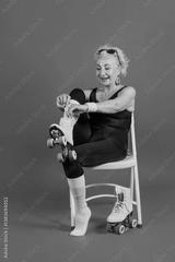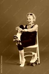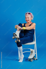 Older hispanic woman gray haired on roller skates and a retro 70s style on blue background