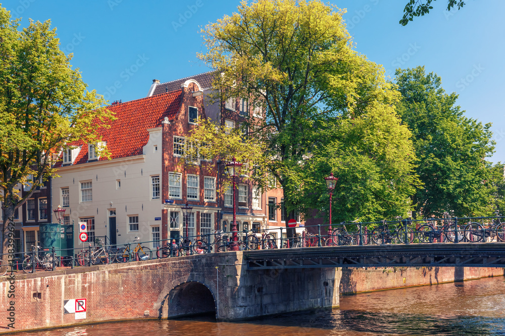 Amsterdam canal, bridge and typical houses in the sunny summer day, Holland, Netherlands.