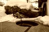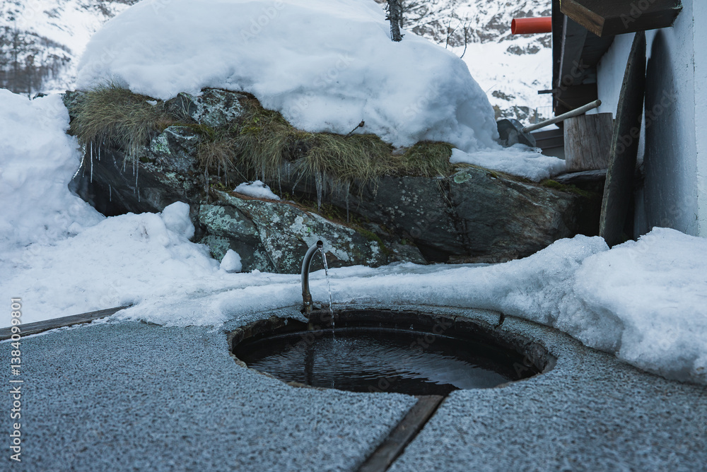 A metal spout pours water into a circular basin surrounded by snow. Rocky terrain with grass and snow patches, icicles, and a building wall are visible.