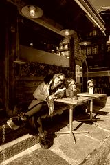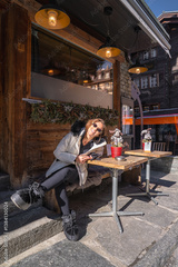 A woman in a white jacket with a fur lined hood sits on a bench outside a wooden cafe in Zermatt. Traditional Swiss buildings and sunlight surround the scene.