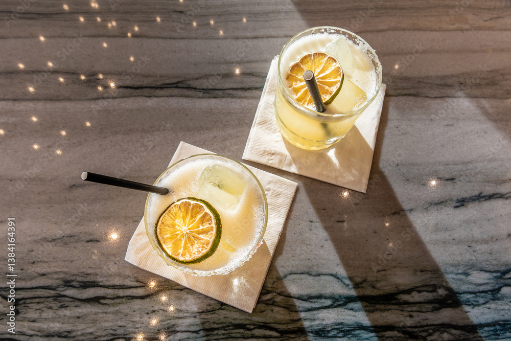 pair of margaritas on a marble table with reflected lights. selective focus on dried lime slice in left glass