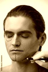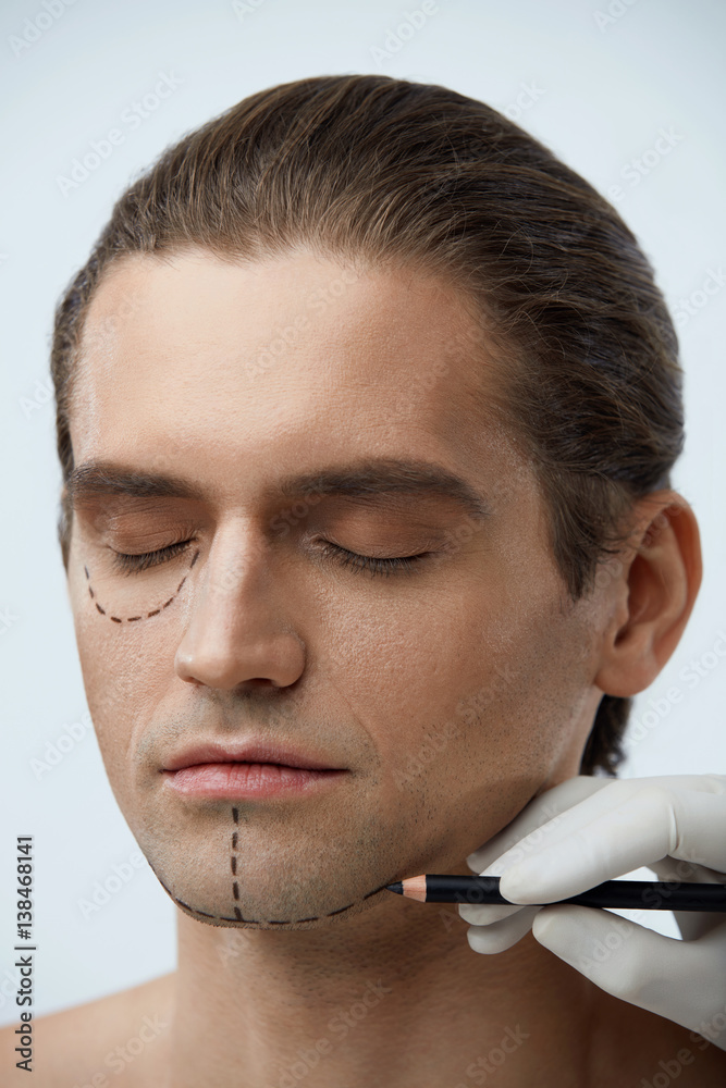 Plastic Surgery. Male Face With Black Lines On Facial Skin