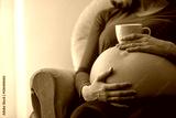 Pregnant woman resting a cup of tea on her belly