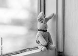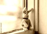 Dreamily bunny sitting alone on the windowsill.