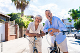 Beautiful happy senior couple dating at the seaside and cycling