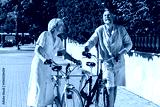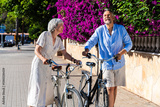 Beautiful happy senior couple dating at the seaside during summertime - Mature married couple in love bonding outdoors and riding bicycle, concepts about elderly lifestyle, transportation and quality