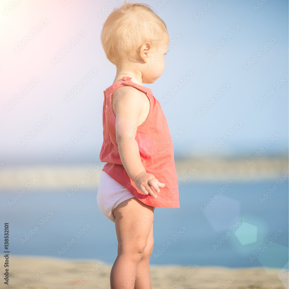 Baby playing on the sandy beach near the sea. Cute little girl in red dress with sand on tropical beach. Ocean coast.