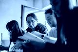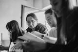 A group of students collaborating on a school assignment, showcasing teamwork and learning. They are focused on books and notes in a bright classroom setting, illustrating education and cooperation.
