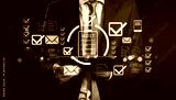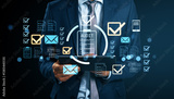 Businessperson using tablet with audit symbols and checklist icons on digital light background for business concept visualization.