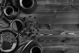 Hot coffee in black cup and several turkish pots cezve with beans, dry leaves with copy space on brown old wooden board background, top view. Rustic style.