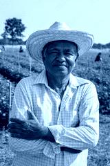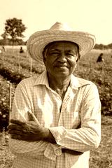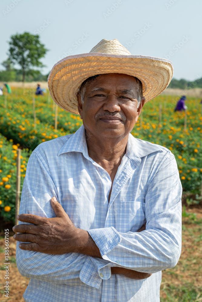 Portrait of elderly male farmer standing with arms crossed and wearing a hat, smiling happily and looking at camera in field of marigolds.