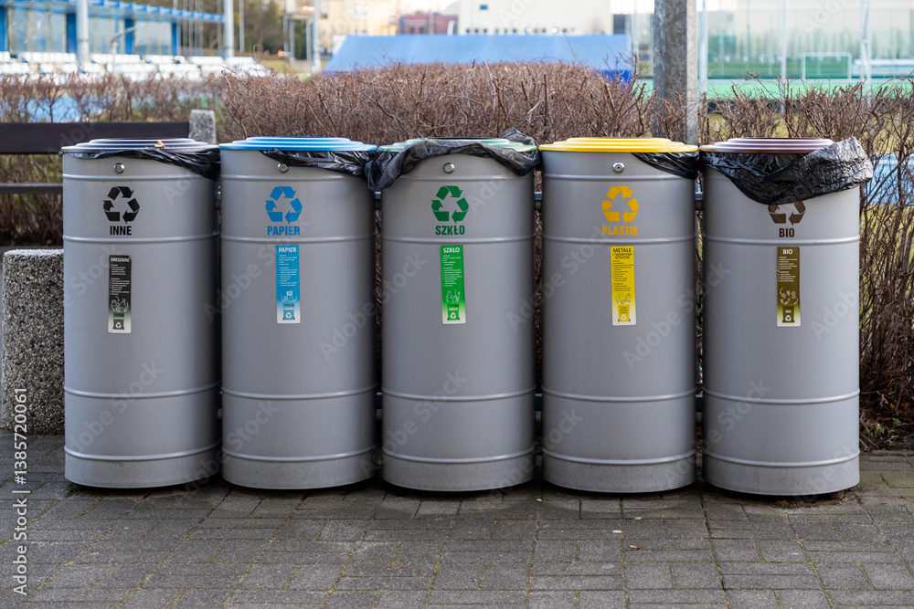 recycling bins for waste separation with color-coded labels for paper glass plastic bio and mixed trash in public outdoor area