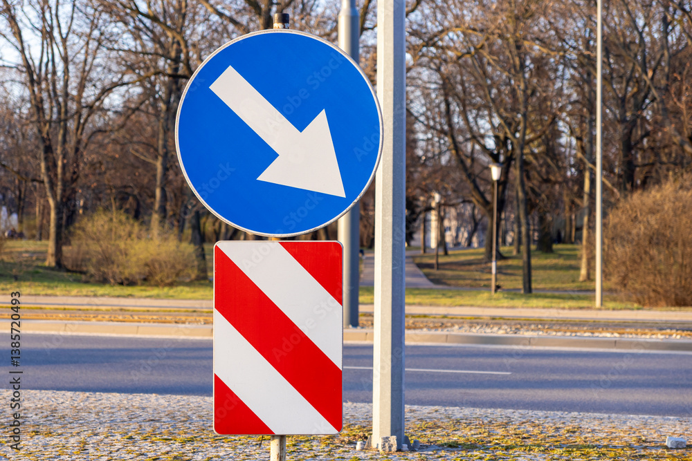 road signs with blue direction arrow and red warning stripes on metal poles near empty street and trees in background during sunny day in urban environment