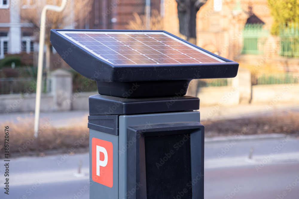 solar powered parking meter with digital display and red p symbol located on urban sidewalk near residential area on sunny day in modern european city street
