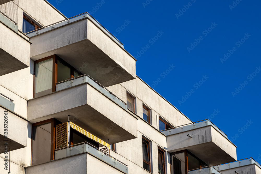 Modern residential apartment building with concrete balconies and glass railings under clear blue sky on a sunny day in contemporary urban neighborhood