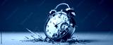 A broken alarm clock surrounded by shattered glass fragments.