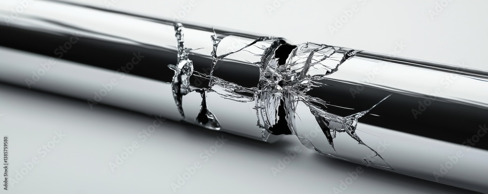 Close-up of a damaged metal pipe with visible cracks and breaks.