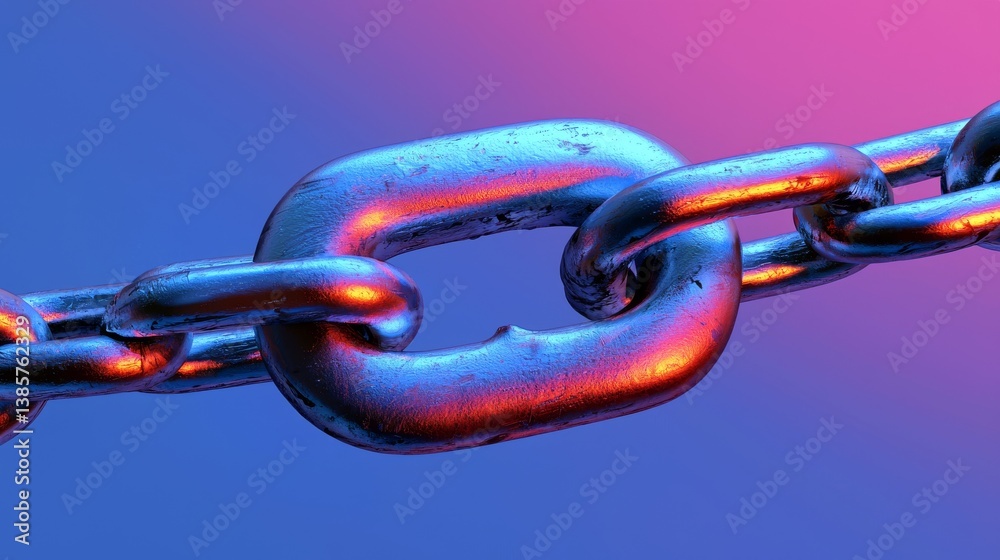Close-up of a metallic chain link on a colorful background.